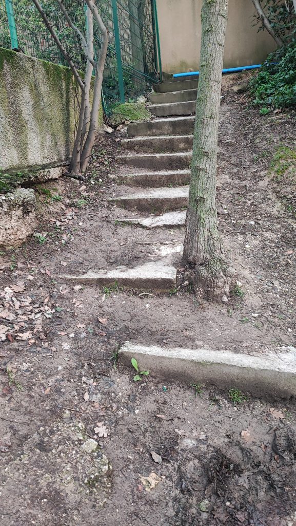 Dans les années 1975 78 cet escalier n’existait pas les résidents de la marguerite ou du club qui souhaitait cheminer de grimper le monticule de terre sans l’aide de ce chemin de béton. Qui alors a pu prendre une telle initiative et surtout pourquoi ? Dans quel but ?