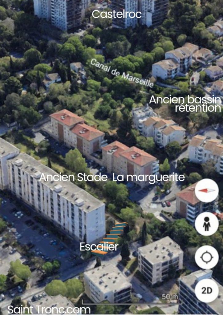Pour comprendre, il nous faut revenir aux années 1978 79 . Cette époque dans le quartier à cet endroit il n’existe quasiment aucune construction entre la marguerite et Castelroc haut . Les villas de la Piboulo sur la droite n’existent pas, grande forêt d’arbres centenaire sépare la Marguerite et le club du centre B Fouque déjà présent depuis les années 1910
